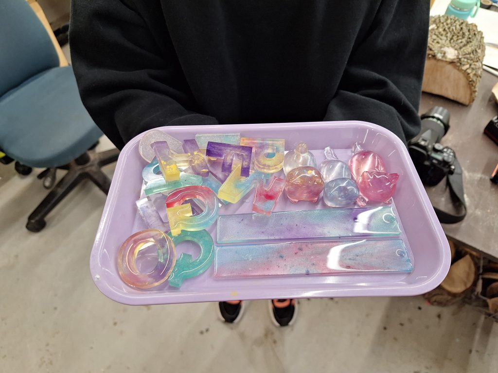 For makerspace this quarter I have worked on multiple things but mainly I have made epoxy stuff for chicken middle. I made a few epoxy cats, 2 epoxy bookmarks, a lot of epoxy letters, and 2 bookmarks. They were really easy and fun to make nothing went wrong and the products came out pretty good.